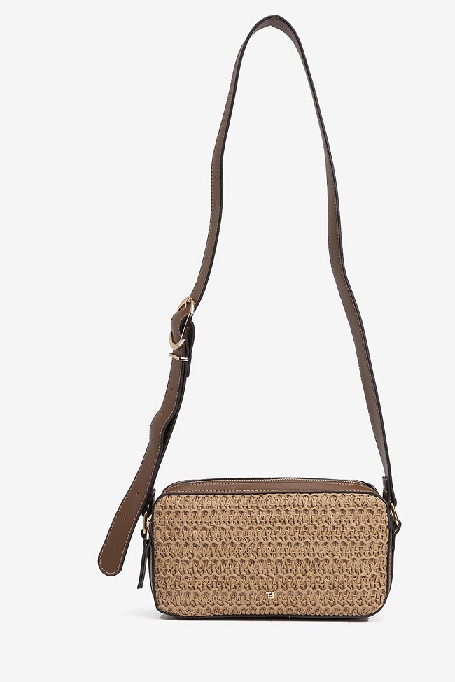Bolso marrón con textura trenzada, cierre dorado y correa ajustable.