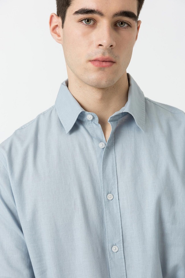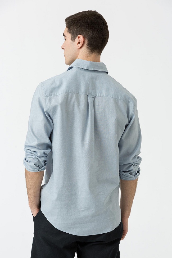 Camisa confeccionada en mezcla de lino con cuello solapa y manga larga.