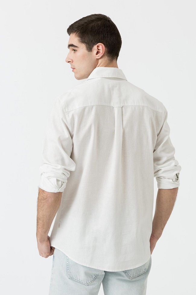 Camisa confeccionada en mezcla de lino con cuello solapa y manga larga.
