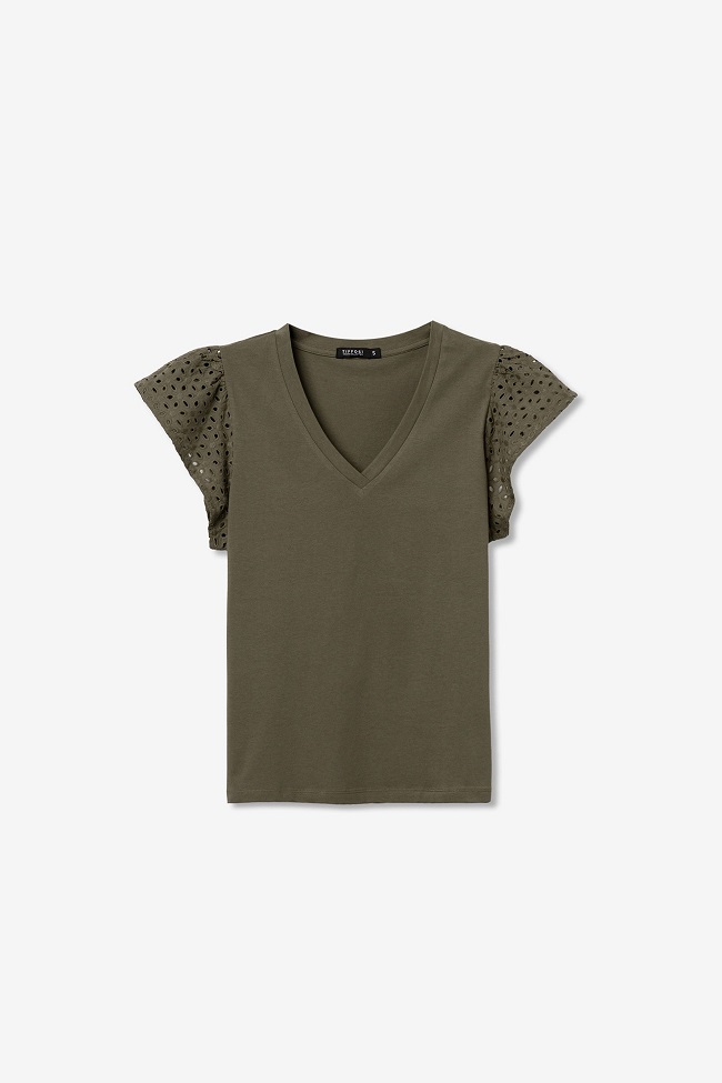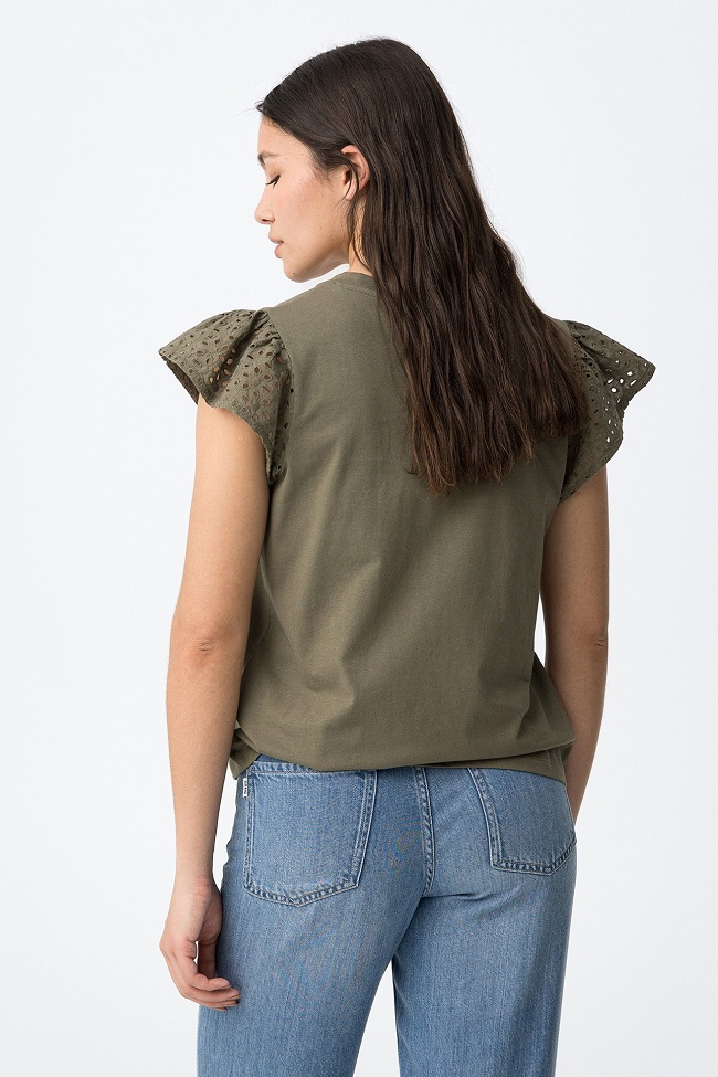 Camiseta con cuello en pico y manga corta en bordado inglés.