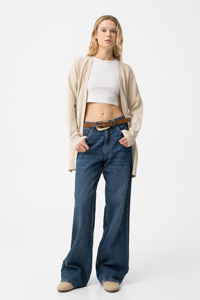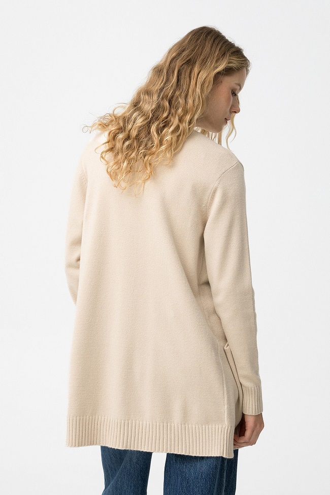 Modelo abierto, sin botonadura, con bolsillos frontales y acabado canelado en mangas y bajo.