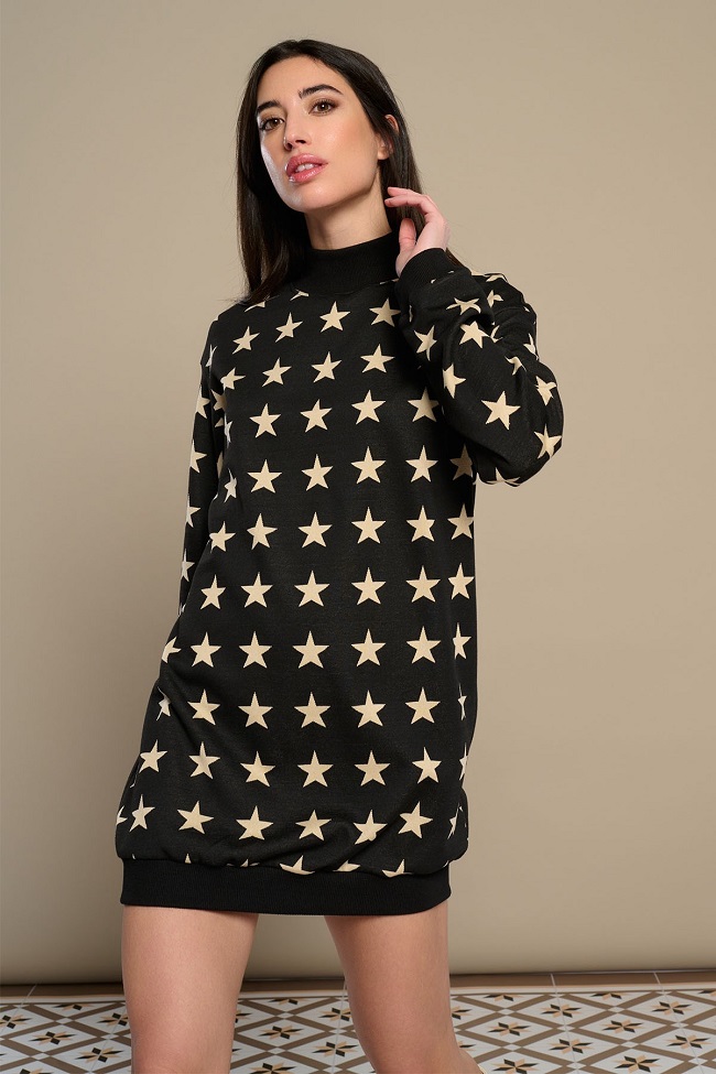 Cuello, puños y bajo en rib. Estampado de estrellas.