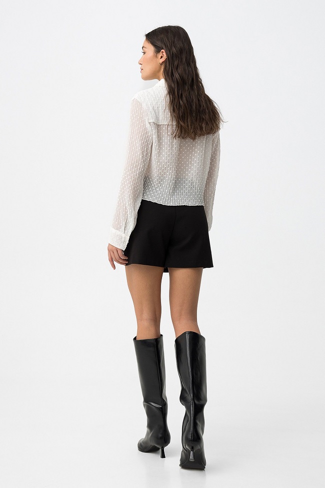 Saia-calção negra con efecto envolvente, diseño minimalista y cierre lateral oculto en la costura.