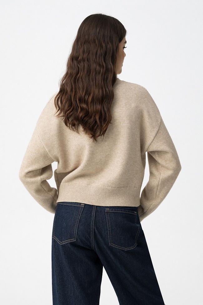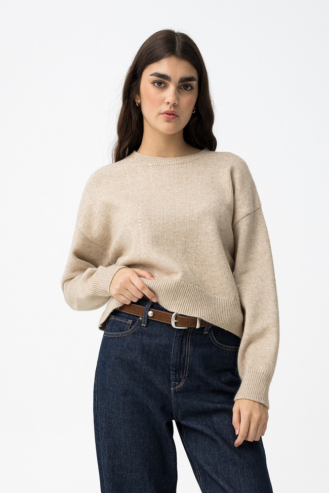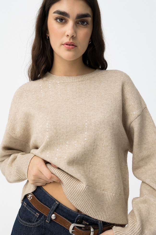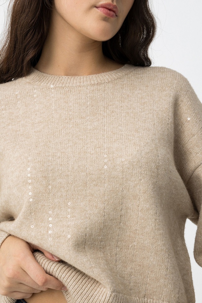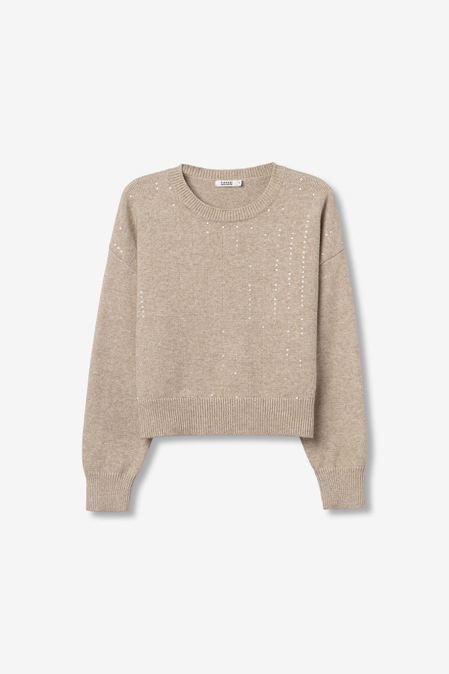 Jersey relaxed fit con lentejuelas, cuello redondo, manga larga y acabados de canalé.