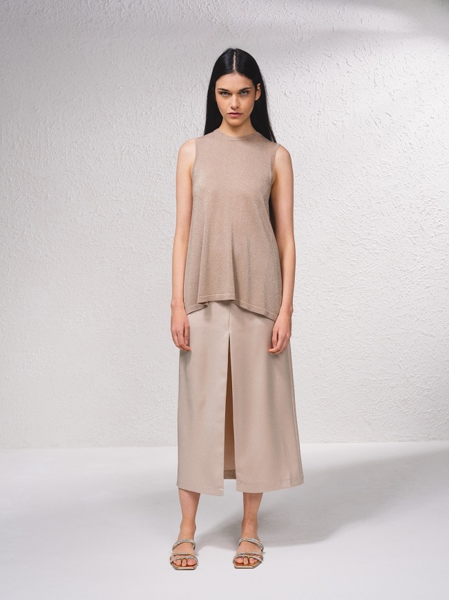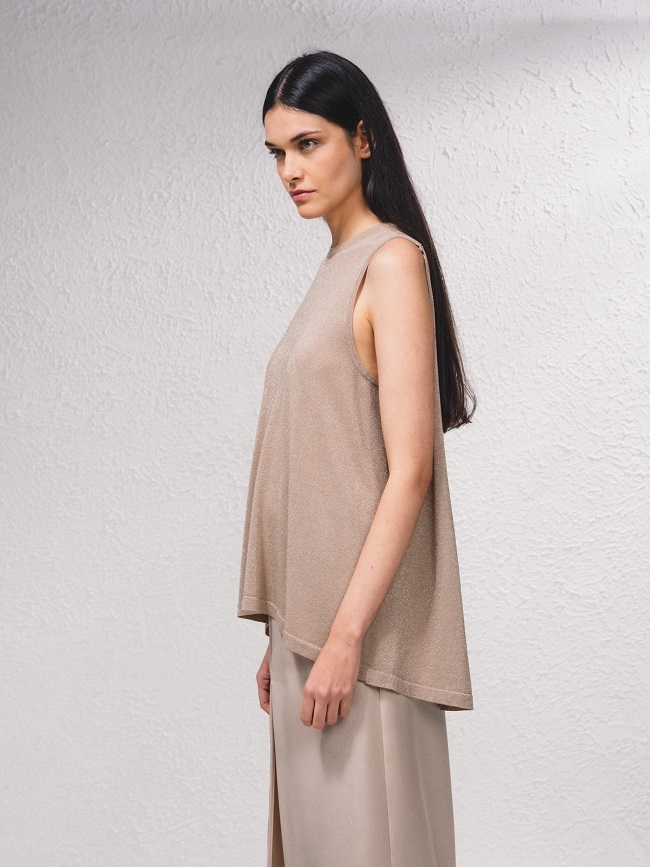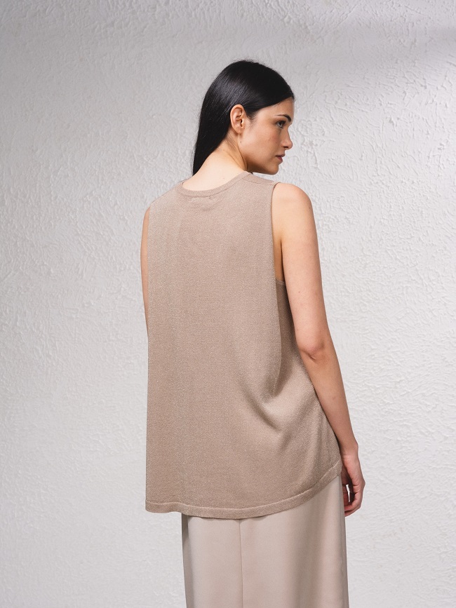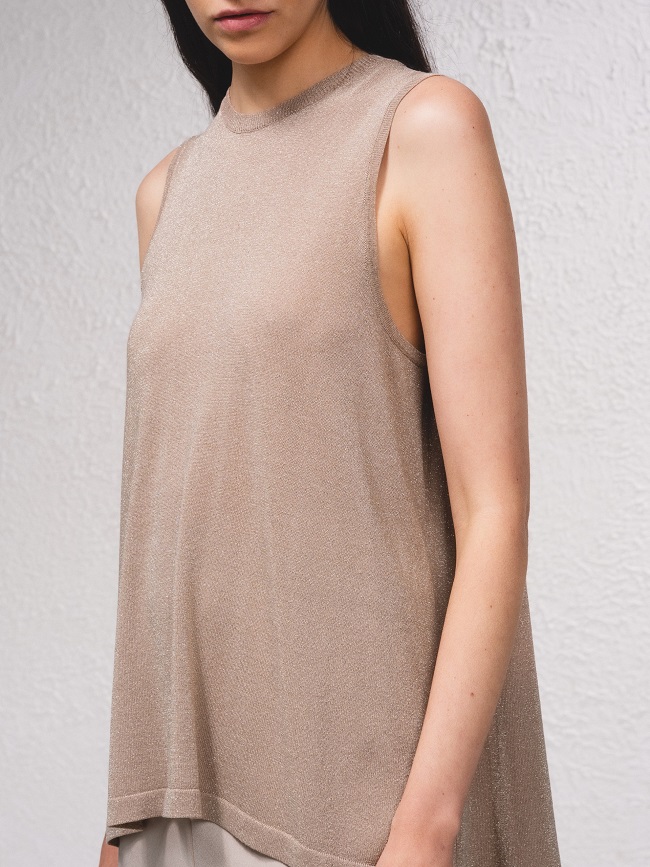Top de punto brillante, amplio y fluido, manga sisa y escote redondo.