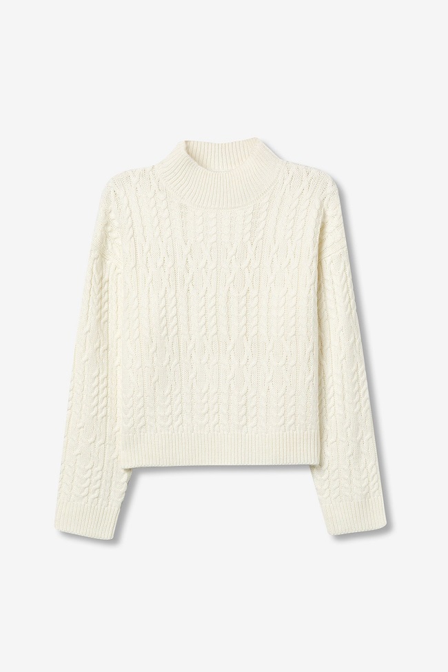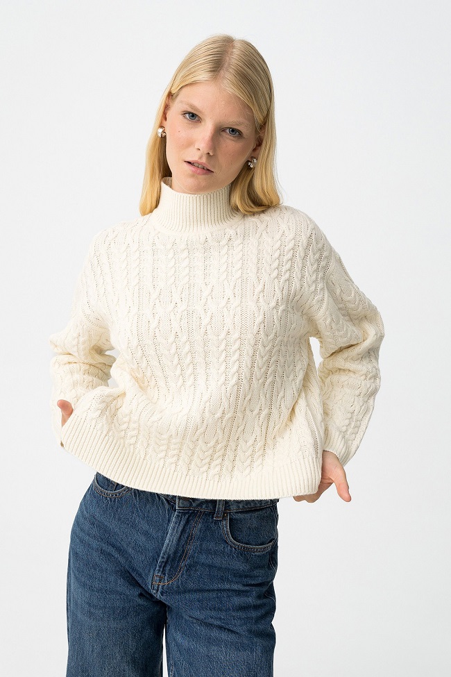 Jersey de corte regular en punto trenzado con cuello alto, manga larga y acabados en canalé.