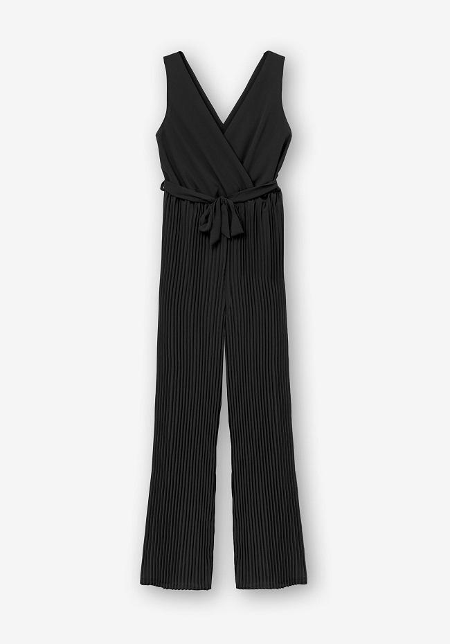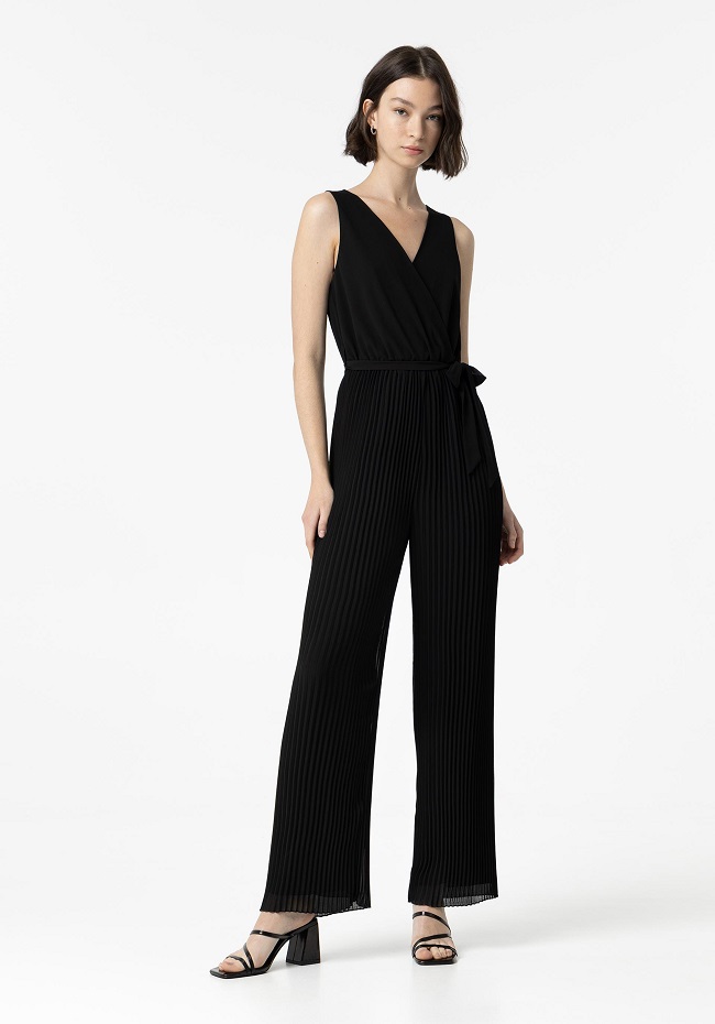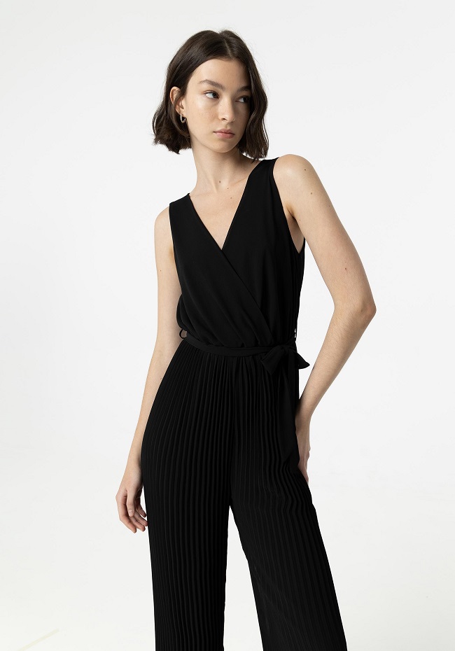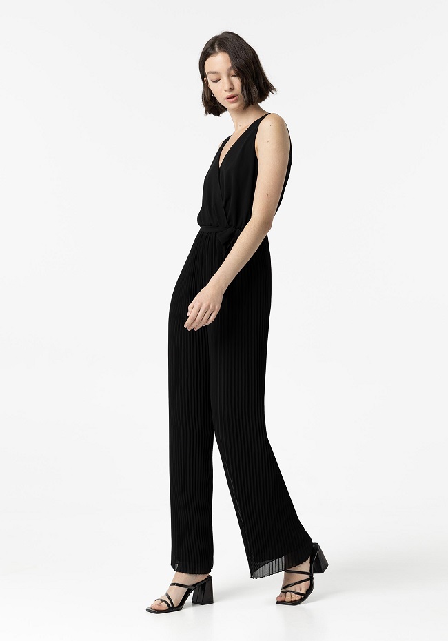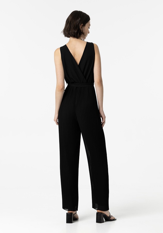 Mono con cuello cruzado y tirantes.