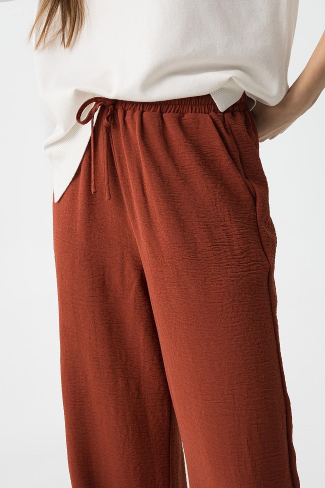 Cintura fruncida con elástico y cordón del mismo tejido.