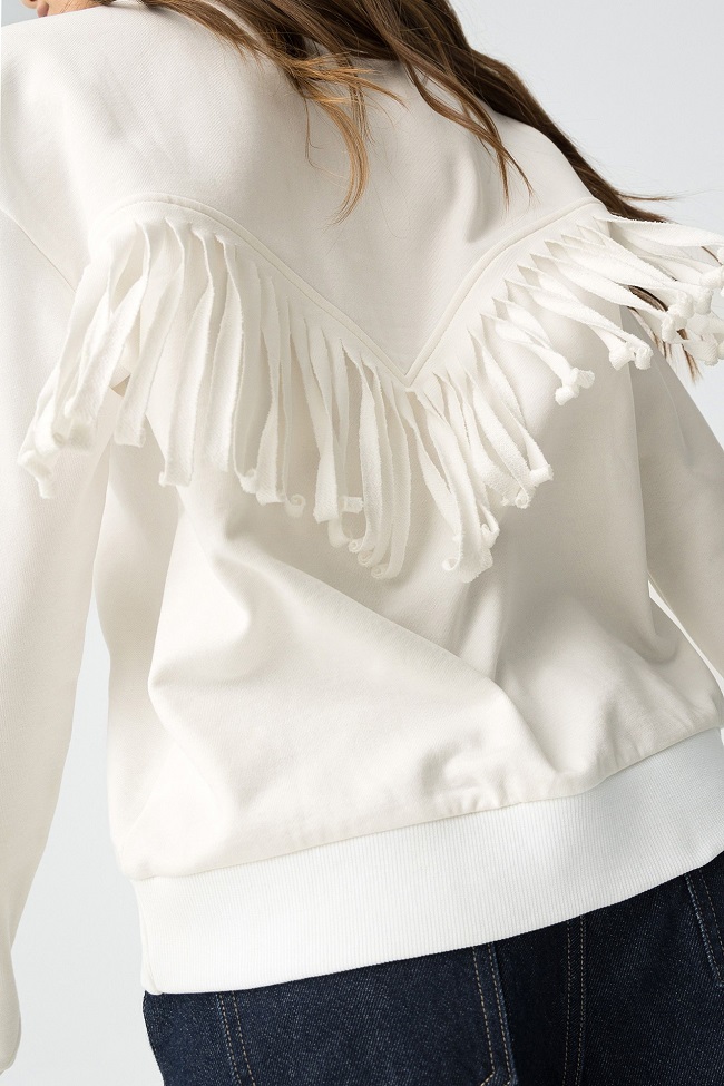 Sudadera regular fit con mensaje bordado y flecos en la espalda. Escote redondo, manga larga y acabados en canalé. Interior afelpado.