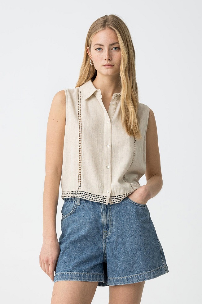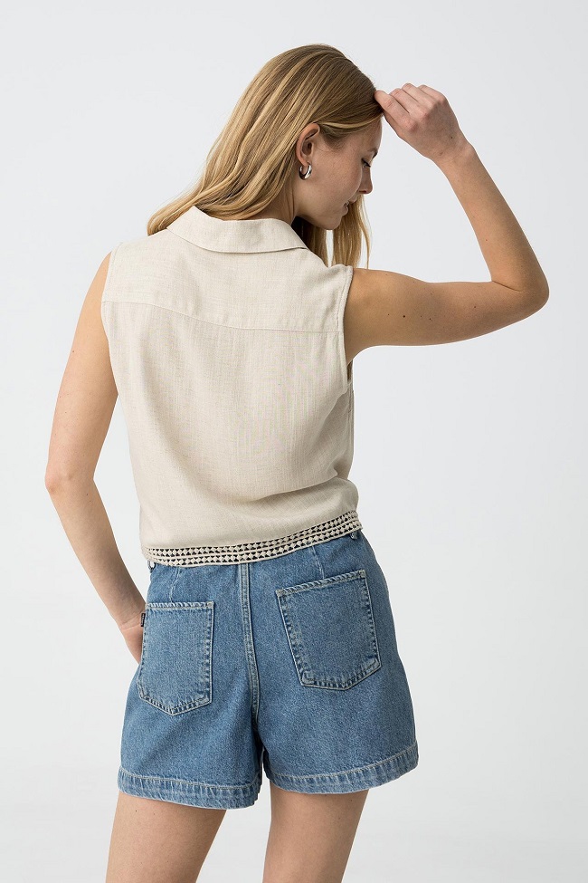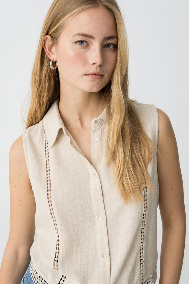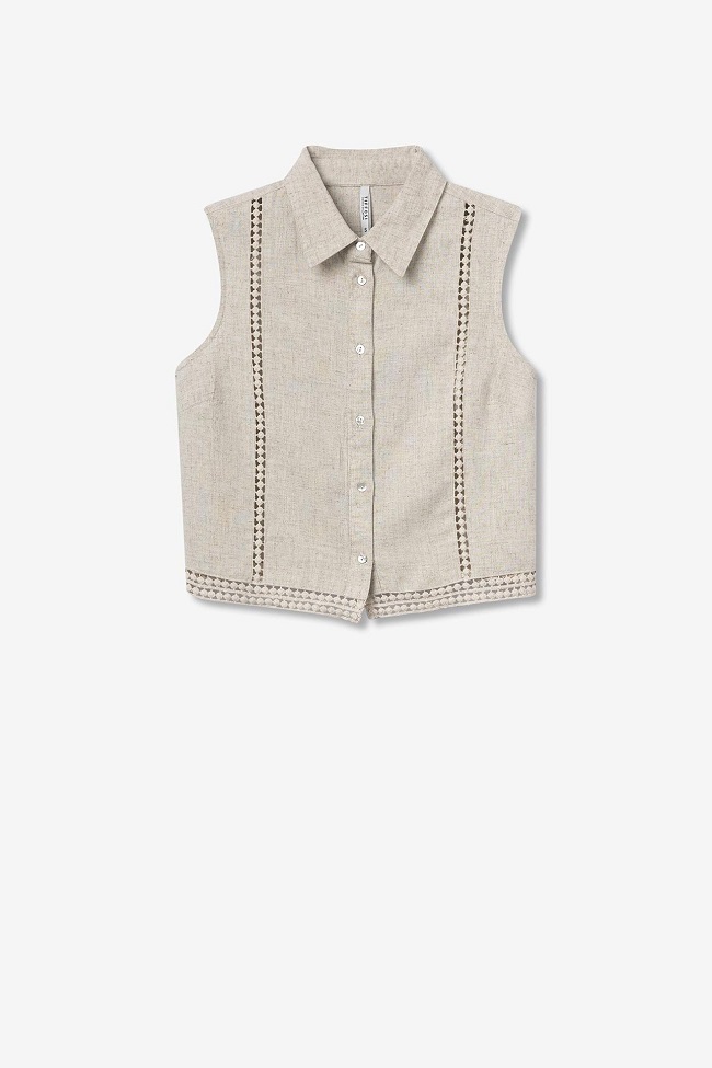 Chaleco de lino con cuello solapa y manga sisa.