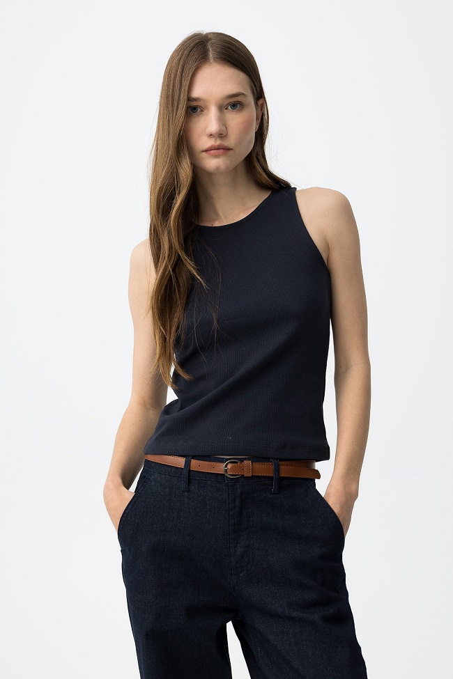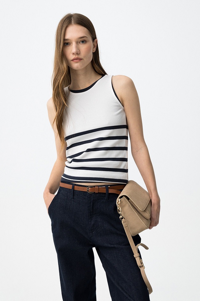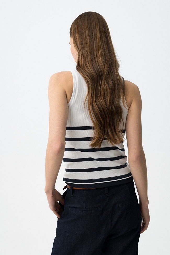 Top ajustado sin mangas, blanco con rayas horizontales azul oscuro, ideal para un look casual.